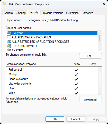 Lastly, I do want to mention these instructions were based on setting permissions on the DBA Manufacturing folder on a Windows 11 machine, and the process may different depending on which Windows Operating System you're running on your server.